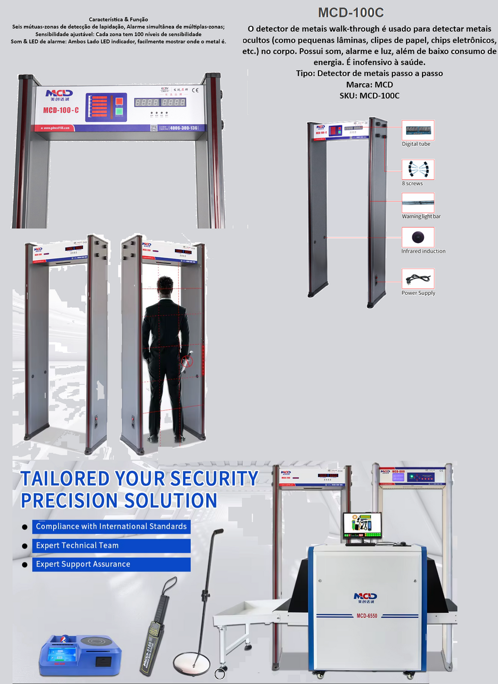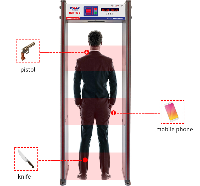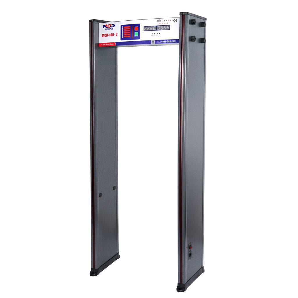 O MCD-100C é econômico, prático e tem uma bela aparência, detectando com precisão a localização de metais que passam por pessoas. Indicado principalmente para verificação em ambientes internos de fábricas e exposições, como fabricantes de hardware e eletrônicos, para verificar se alguém roubou os metais. É especialmente utilizado em entretenimento, como KTV, bares e pistas de patinação.
