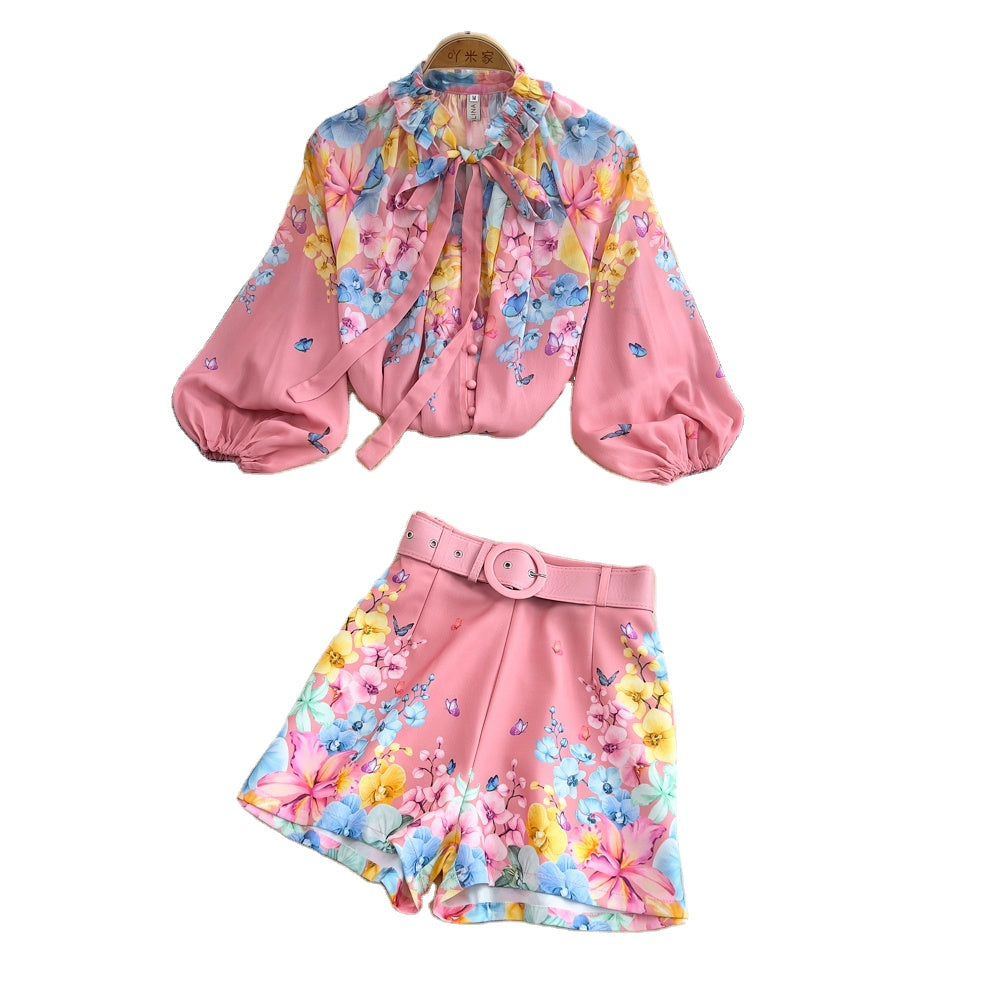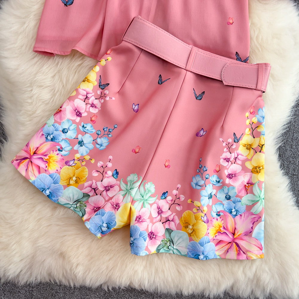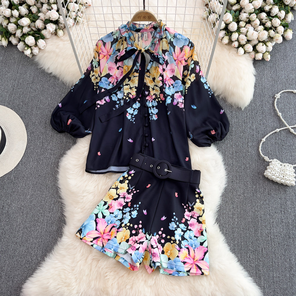 Conjunto feminino com estampa, 2 peças camisa e short.