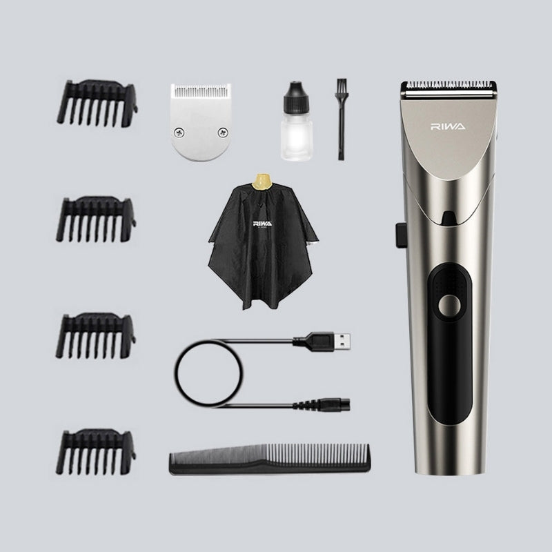 8. The package includes: host, four limit combs, surrounding cloth, oil bottle, brush, comb, USB charging cable